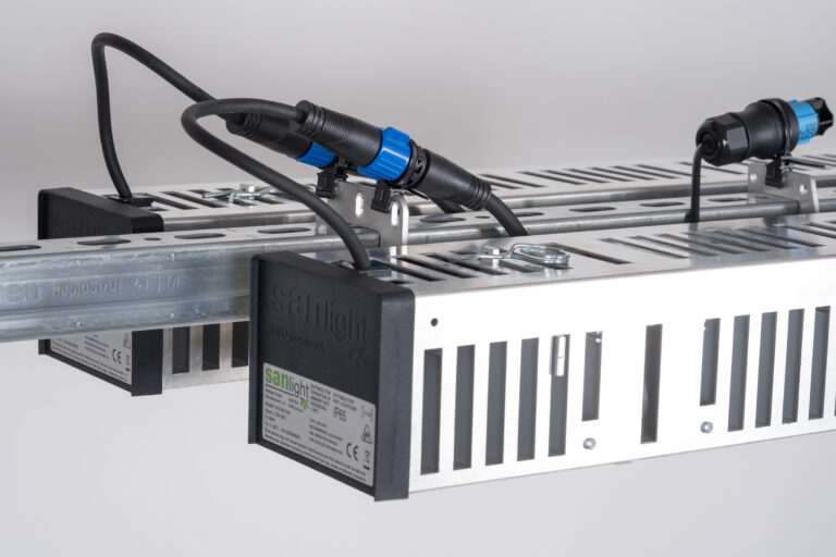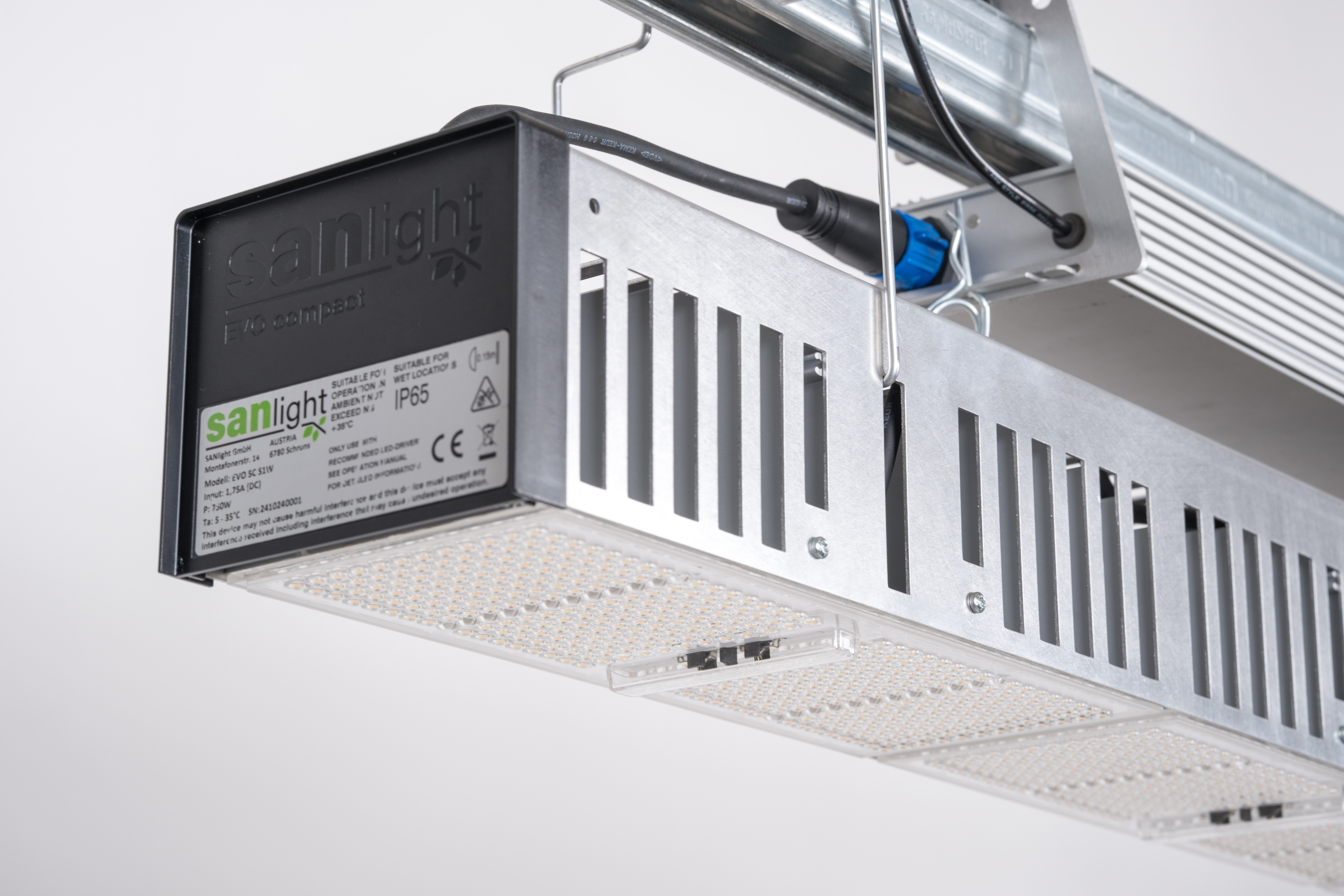 The SANlight EVO COMPACT series combines maximum light output with outstanding efficiency in a compact format. Its broadband spectrum with an optimized FarRed/Red ratio supports plants through all stages of growth — from strong vegetative development to abundant flowering. This makes it an excellent choice not only for professional cannabis cultivation but also for a wide range of greenhouse crops.